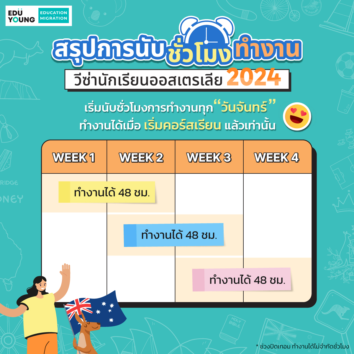 นอกจากนี้ ทางรัฐบาลออสเตรเลียยังเปิดโอกาสให้ผู้ที่ถือ "วีซ่านักเรียน" สามารถทำงานแบบ Part-time ระหว่างเรียนได้สูงสุดที่ 48 ชั่วโมงต่อ 2 สัปดาห์ สำหรับผู้ที่ถือวีซ่านักเรียนที่ลงทะเบียนเรียนคอร์สภาษา, วิชาชีพ และปริญญาตรี* โดยรายละเอียดสามารถตรวจสอบได้ที่ตารางด้านล่างนี้เลย