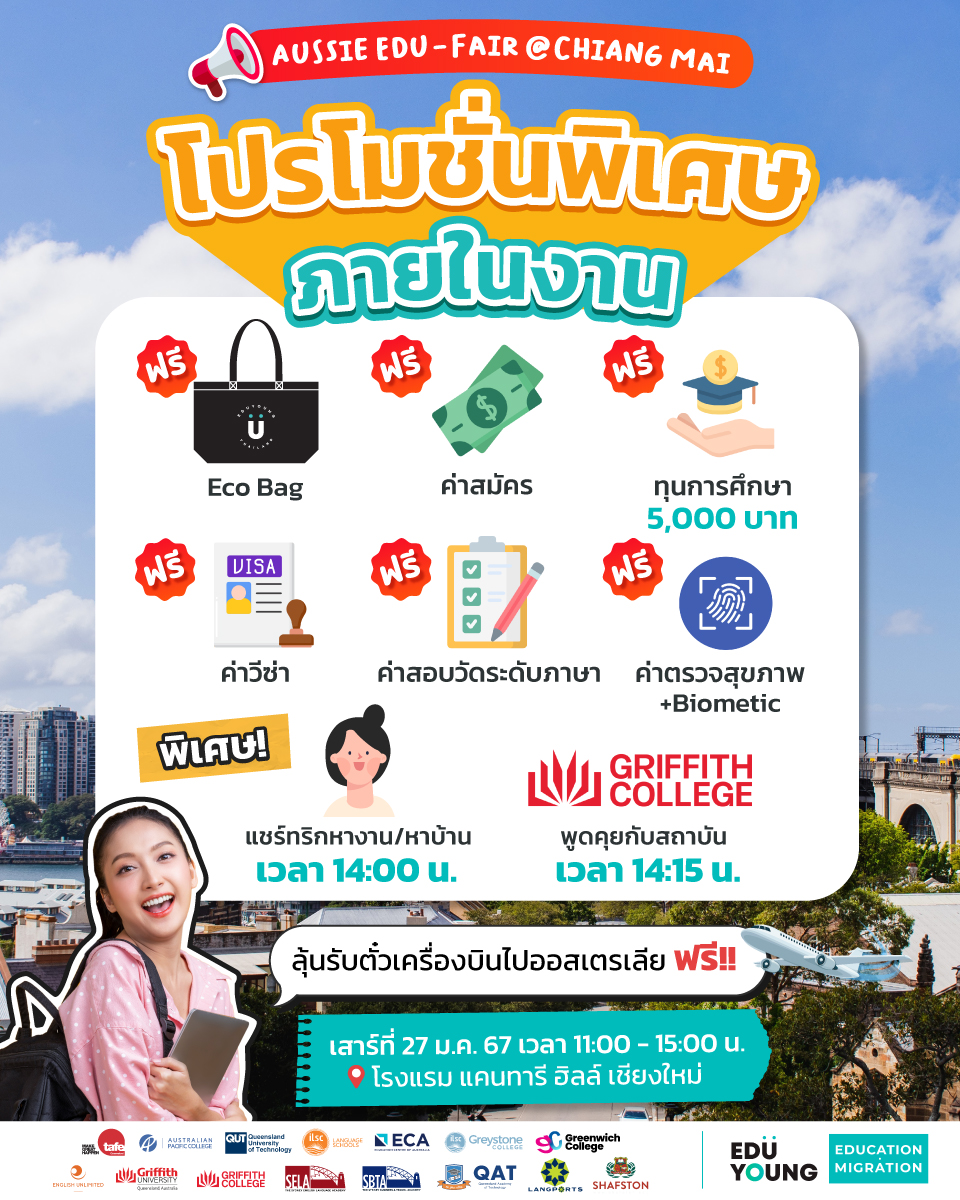 พบพี่ ๆ ทีมงาน EduYoung Thailand ที่มีประสบการณ์การเรียนที่ออสเตรเลียมาให้คำปรึกษากันแบบตัวต่อตัว แนะนำการเลือกคอร์สเรียน + เลือกเมืองเรียน รวมทั้งแชร์ทริกการหาบ้าน หางานในออสเตรเลีย พร้อมรับฟังสัมมนาจาก Griffith College