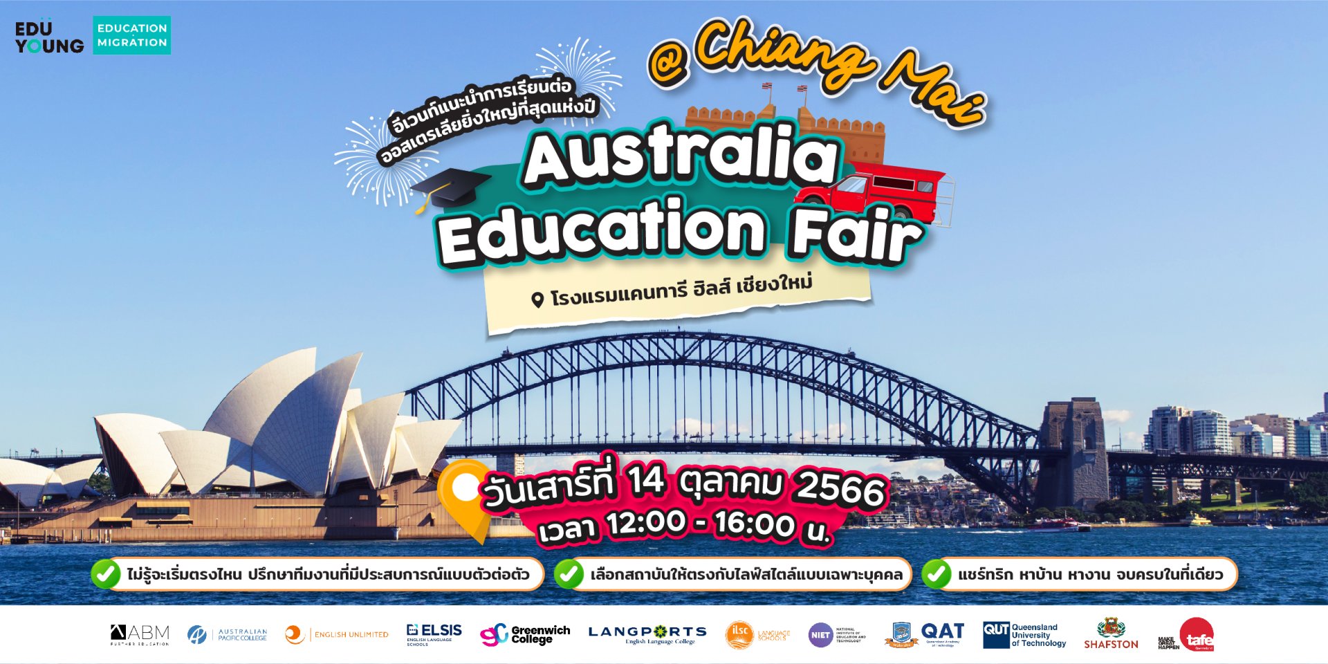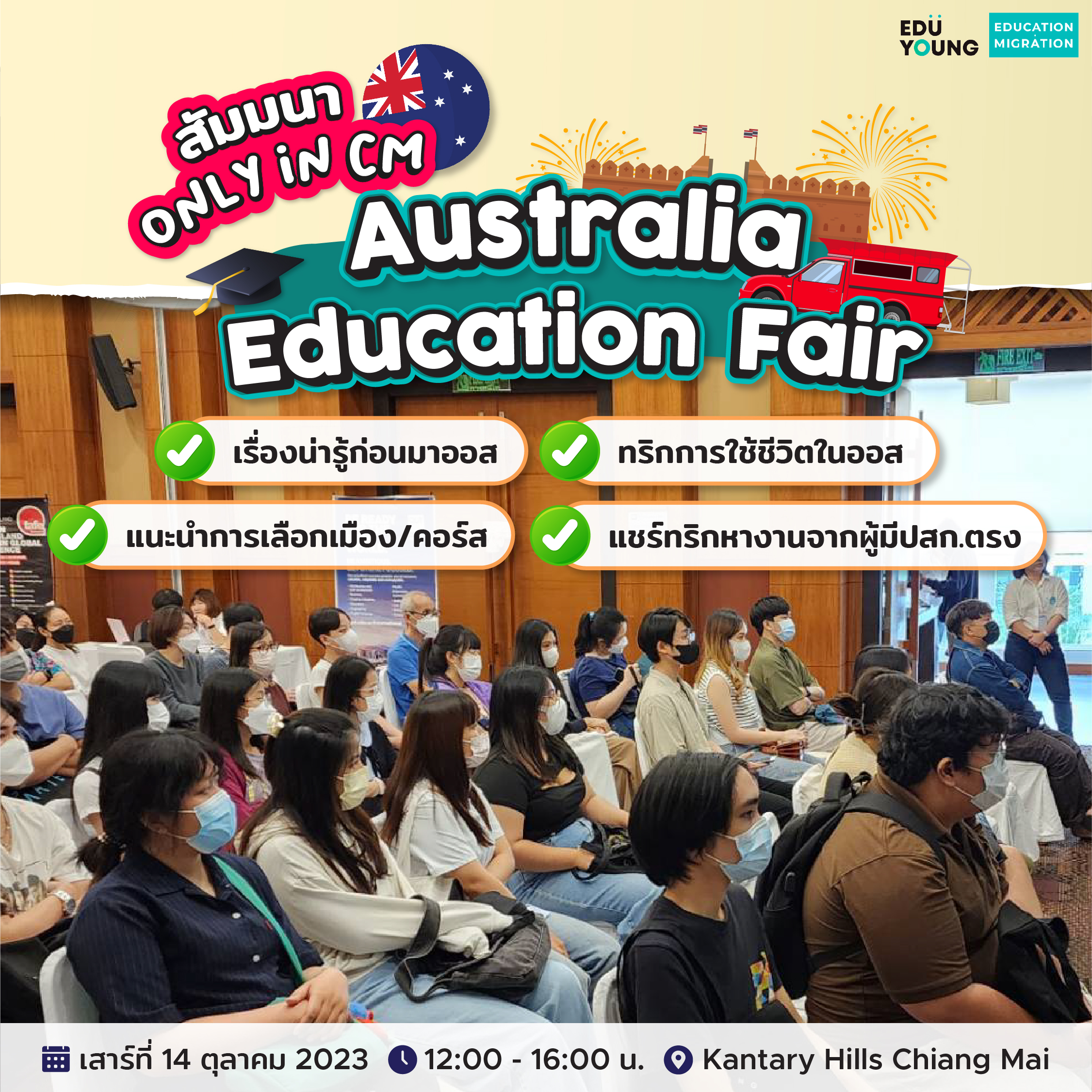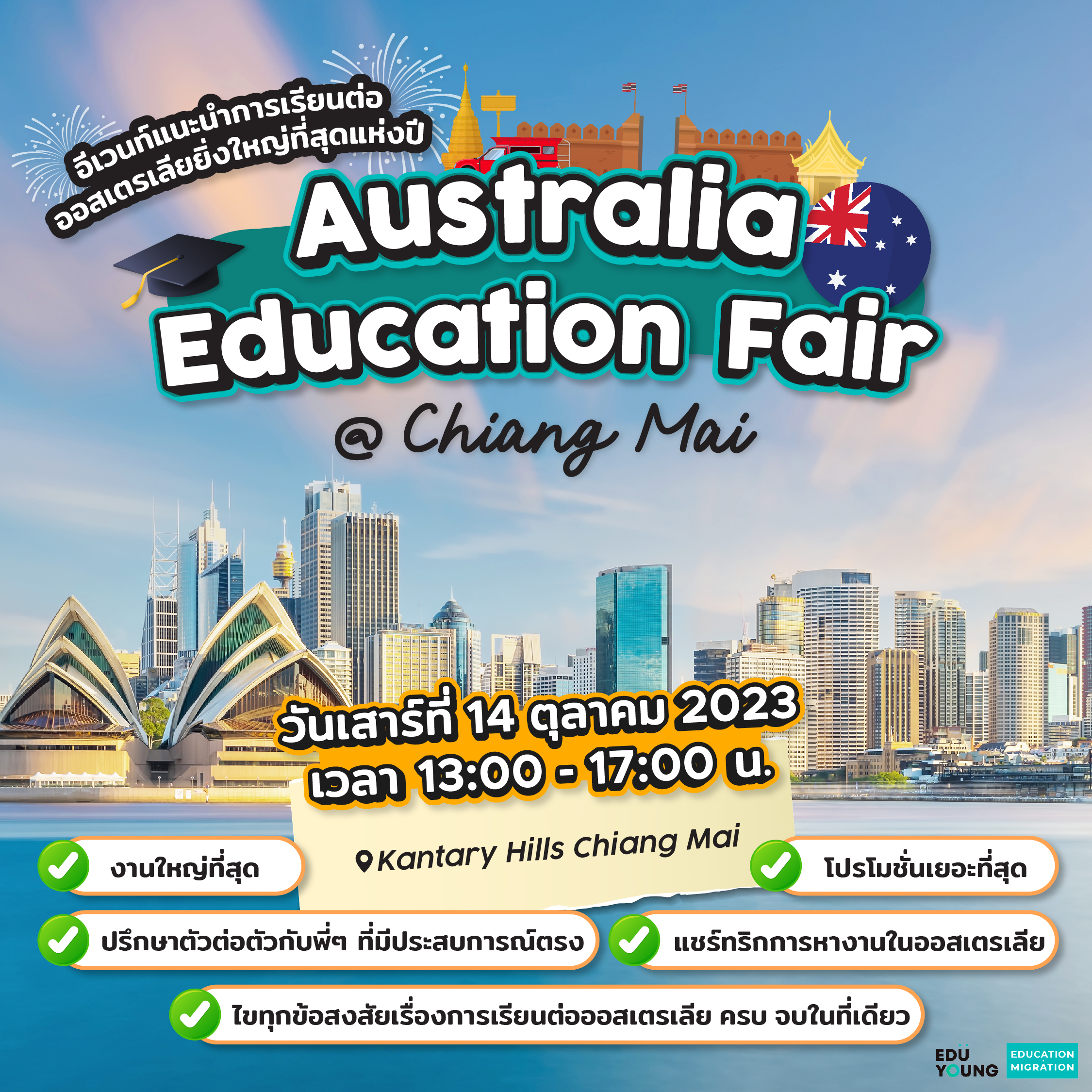 สนใจเรียนต่อออสเตรเลีย ปรึกษาเจ้าหน้าที่ EduYoung Thailand ได้ในงาน Australia Education Fair @Chiang Mai งานอีเวนท์แนะนำการเรียนต่อออสเตรเลียครั้งยิ่งใหญ่ที่สุดแห่งปี 2023 ในวันเสาร์ที่ 14 ตุลาคมนี้เลย