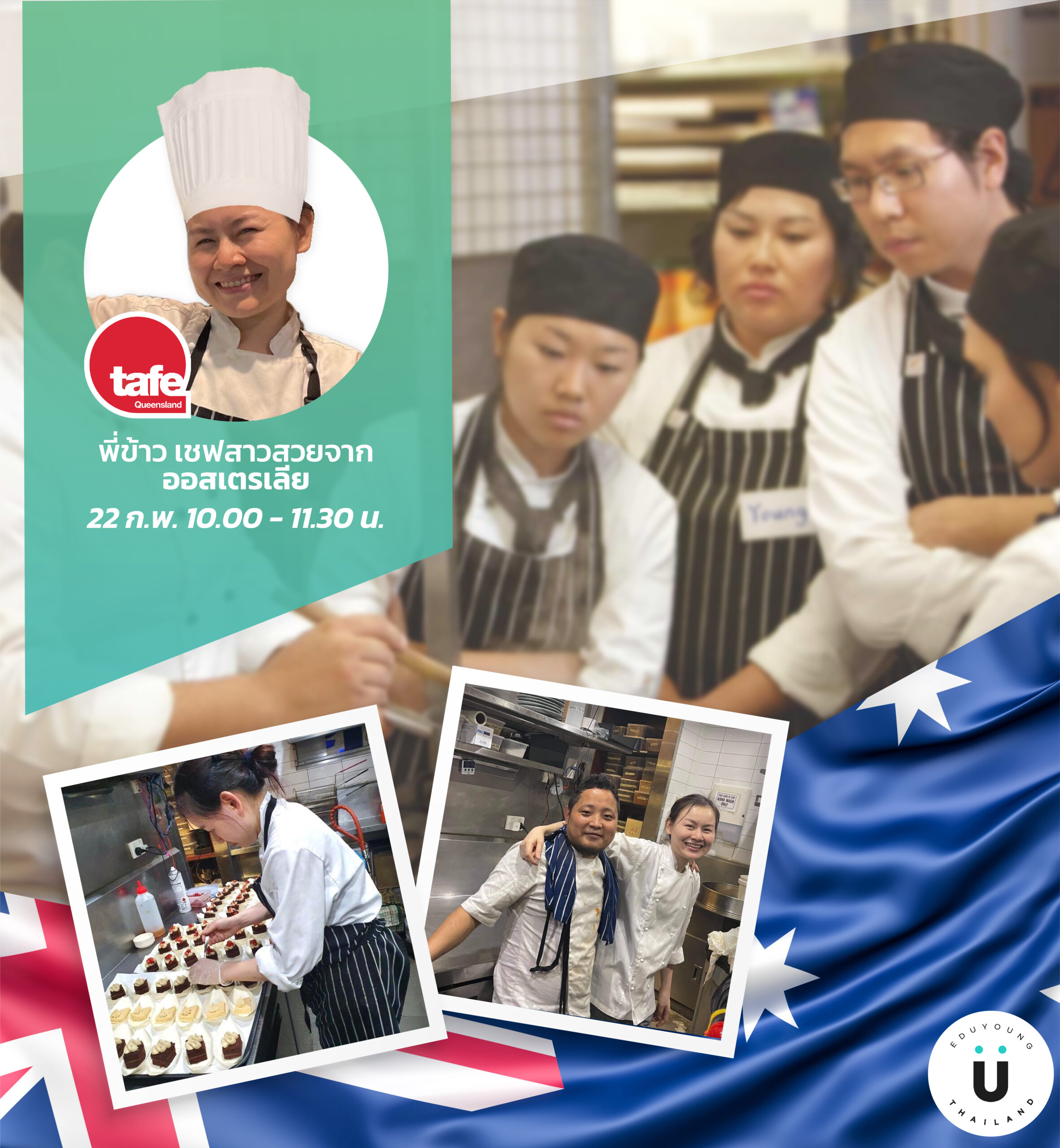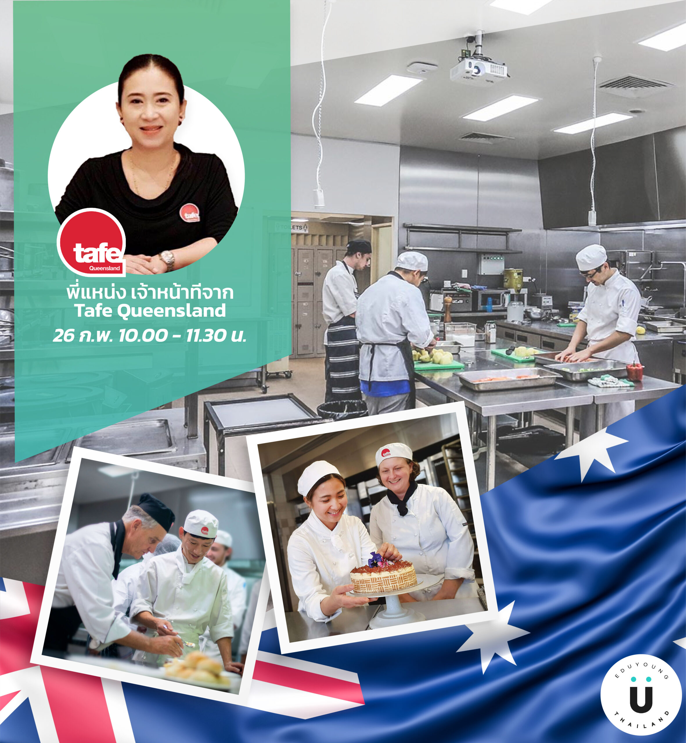 - วันที่ 26 กุมภาพันธ์ นี้ พี่แหน่ง เจ้าหน้าที่คนไทยประจำ TAFE Queensland สถาบันของรัฐบาลออสเตรเลีย ที่การันตีได้ถึงคุณภาพทางการศึกษา จะมาพูดคุยถึงหลักสูตรการเรียนเชฟ