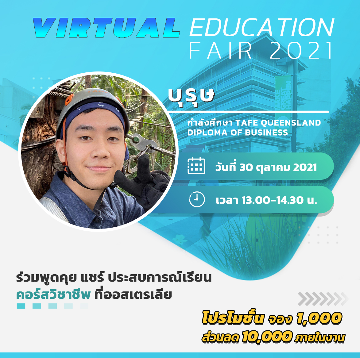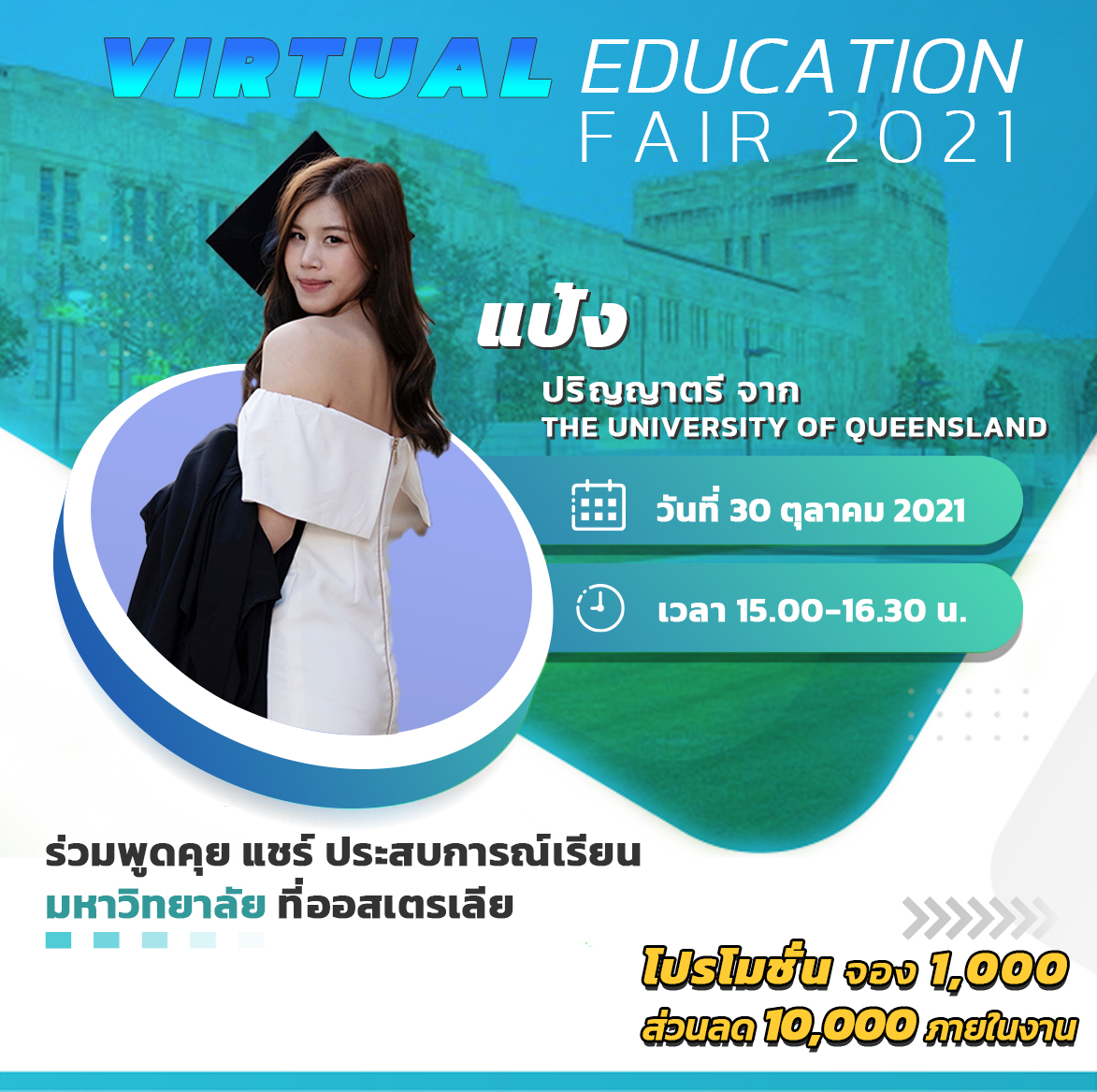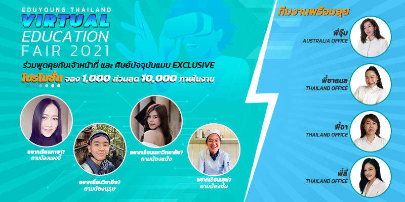 EduYoung Thailand Virtual Education Fair ครั้งยิ่งใหญ่ส่งท้ายปี 2021 กลับมาอีกครั้ง!! อยากเรียน ภาษา , อยากเรียน Diploma , อยากเรียนมหาวิทยาลัย แบ่งช่วงเวลาตามความสนใจ จองสิทธิ์ 1,000 บาท รับส่วนลด 10,000 บาท ภายในงาน (จำนวนจำกัด)