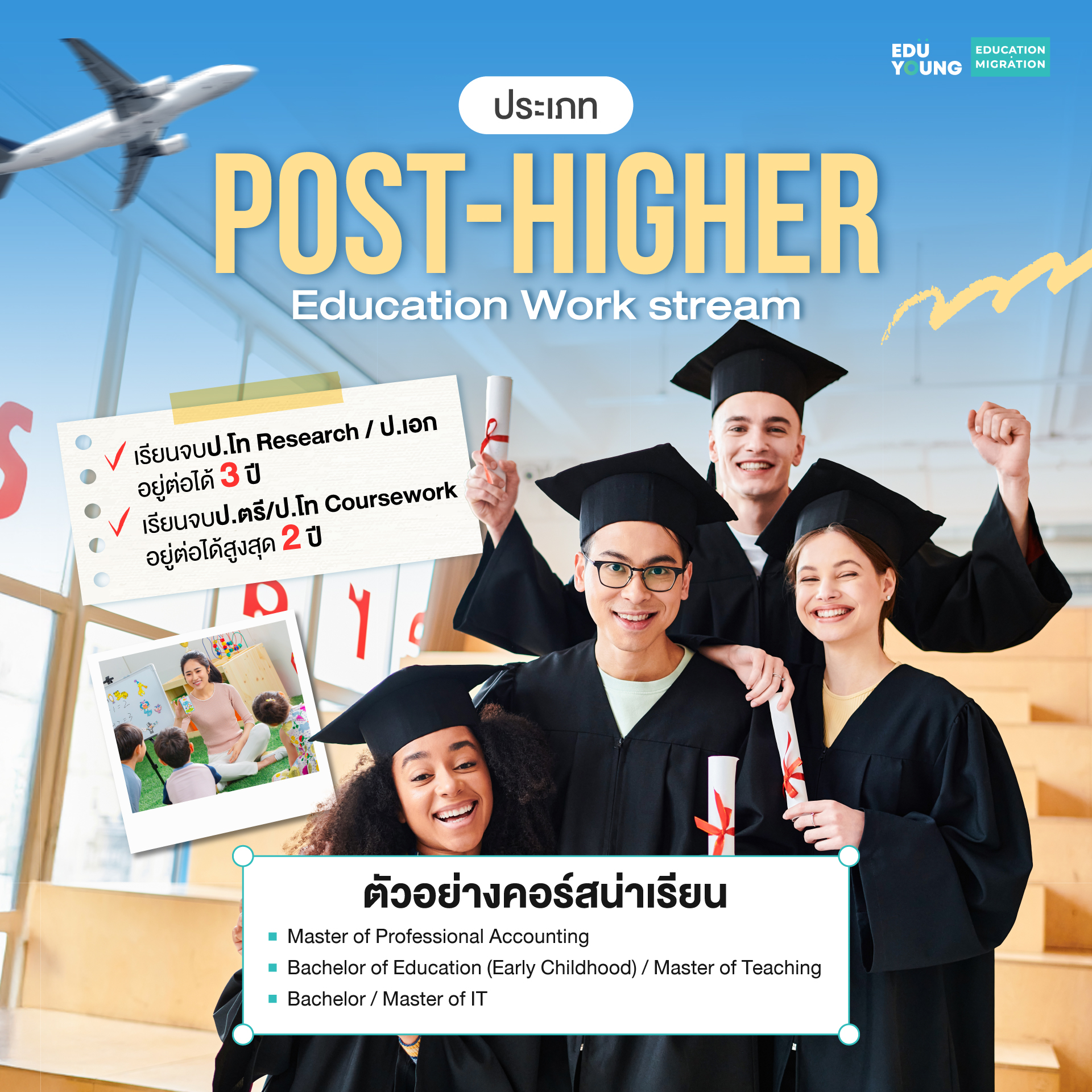 - Post-Higher Education Work Stream สำหรับผู้เรียนระดับ Bachelor's Degree, Master's Degree, Doctoral Degree, Graduate Certificate/Diploma
